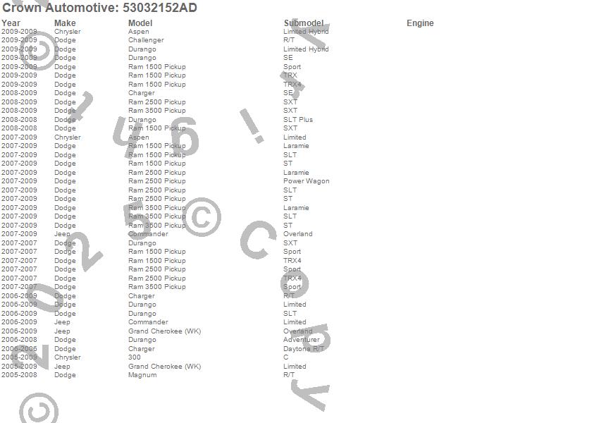 300, Aspen, Challenger, Charger, Commander, Durango, Grand Cherokee (WK), Magnum, Ram 1500, Ram 2500, Ram 3500, Chrysler, Dodge, Jeep, 2009, 2008, 2007, 2006, 2005 more…