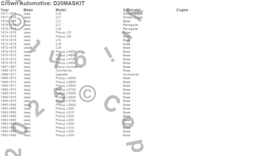 Crown Automotive Transfer Case Overhaul Kit D20MASKIT Features: