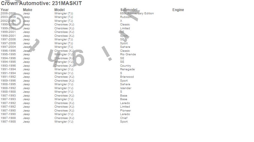 Crown Automotive is the premier manufacturer and distributor of quality replacement parts for Jeep® CJ™, Wrangler™, Cherokee™, Grand Cherokee™, Liberty™, and Commander™."From humble beginnings in 1963 in a small Boston storefront, Crown Automotive has consistently maintained its commitment to offering only quality parts and exceptional service. Today, with warehouses in Massachusetts, Georgia, Nevada, Spain, and the Czech Republic, totaling over 160,000 square feet, Crown Automotive continues to be the leader in quality replacement parts for Jeep® vehicles. With over 8,000 different parts in stock for Jeep® vehicles from 1942 on up, Crown has the largest stock of replacement parts for Jeep® vehicles, including factory-discontinued parts. In fact, many of the older Jeeps are still on (and off) the road thanks to Crown parts. The Crown line consists of axle, body, brake, clutch, cooling, driveline, electrical, engine, exhaust, fuel, steering, suspension, transmission and transfer case components. Crown Automotive also offers an exclusive line of component kits and accessory products. Because we know that Jeeps are driven harder than most other vehicles, we emphasize offering only quality parts. In fact, we test parts on Jeeps before distributing them to our dealers to insure that they meet our standards for quality. Crown also supports its entire line with a 12 month/12,000 mile warranty to insure our dealers and their customers of our commitment to offering quality parts. We know from experience that Jeep® owners would rather pay a little more for a good quality part that's backed by a strong guarantee. But we know that price is important as well. So, not only will you find Crown parts to be of exceptional quality, but you'll find them at a great price too.