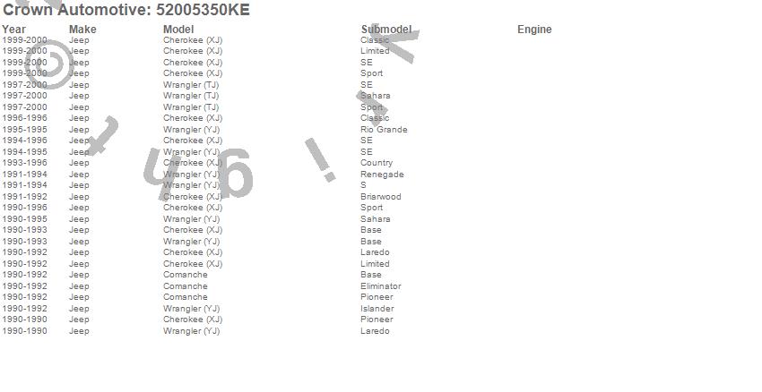 Crown Automotive is the premier manufacturer and distributor of quality replacement parts for Jeep® CJ™, Wrangler™, Cherokee™, Grand Cherokee™, Liberty™, and Commander™."From humble beginnings in 1963 in a small Boston storefront, Crown Automotive has consistently maintained its commitment to offering only quality parts and exceptional service. Today, with warehouses in Massachusetts, Georgia, Nevada, Spain, and the Czech Republic, totaling over 160,000 square feet, Crown Automotive continues to be the leader in quality replacement parts for Jeep® vehicles. With over 8,000 different parts in stock for Jeep® vehicles from 1942 on up, Crown has the largest stock of replacement parts for Jeep® vehicles, including factory-discontinued parts. In fact, many of the older Jeeps are still on (and off) the road thanks to Crown parts. The Crown line consists of axle, body, brake, clutch, cooling, driveline, electrical, engine, exhaust, fuel, steering, suspension, transmission and transfer case components. Crown Automotive also offers an exclusive line of component kits and accessory products. Because we know that Jeeps are driven harder than most other vehicles, we emphasize offering only quality parts. In fact, we test parts on Jeeps before distributing them to our dealers to insure that they meet our standards for quality. Crown also supports its entire line with a 12 month/12,000 mile warranty to insure our dealers and their customers of our commitment to offering quality parts. We know from experience that Jeep® owners would rather pay a little more for a good quality part that's backed by a strong guarantee. But we know that price is important as well. So, not only will you find Crown parts to be of exceptional quality, but you'll find them at a great price too.