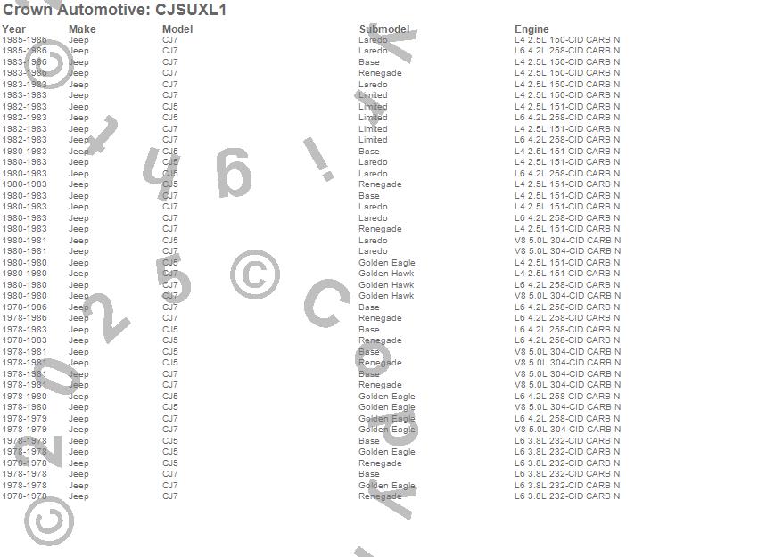 Crown Automotive is the premier manufacturer and distributor of quality replacement parts for Jeep® CJ™, Wrangler™, Cherokee™, Grand Cherokee™, Liberty™, and Commander™."From humble beginnings in 1963 in a small Boston storefront, Crown Automotive has consistently maintained its commitment to offering only quality parts and exceptional service. Today, with warehouses in Massachusetts, Georgia, Nevada, Spain, and the Czech Republic, totaling over 160,000 square feet, Crown Automotive continues to be the leader in quality replacement parts for Jeep® vehicles. With over 8,000 different parts in stock for Jeep® vehicles from 1942 on up, Crown has the largest stock of replacement parts for Jeep® vehicles, including factory-discontinued parts. In fact, many of the older Jeeps are still on (and off) the road thanks to Crown parts. The Crown line consists of axle, body, brake, clutch, cooling, driveline, electrical, engine, exhaust, fuel, steering, suspension, transmission and transfer case components. Crown Automotive also offers an exclusive line of component kits and accessory products. Because we know that Jeeps are driven harder than most other vehicles, we emphasize offering only quality parts. In fact, we test parts on Jeeps before distributing them to our dealers to insure that they meet our standards for quality. Crown also supports its entire line with a 12 month/12,000 mile warranty to insure our dealers and their customers of our commitment to offering quality parts. We know from experience that Jeep® owners would rather pay a little more for a good quality part that's backed by a strong guarantee. But we know that price is important as well. So, not only will you find Crown parts to be of exceptional quality, but you'll find them at a great price too.