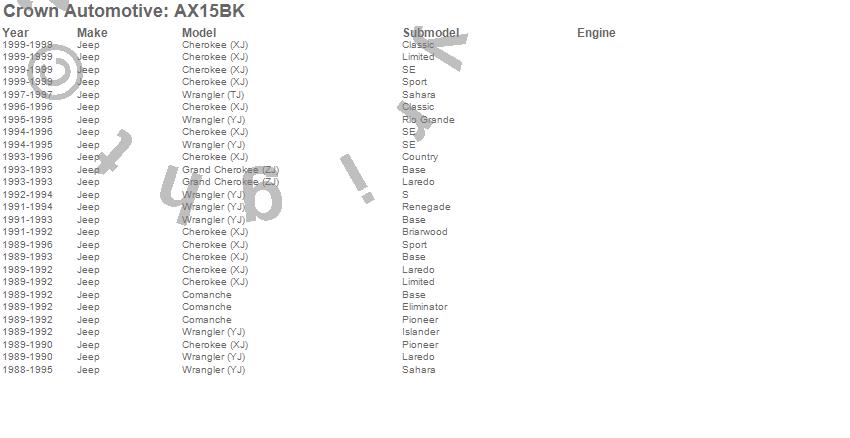 Cherokee (XJ), Comanche, Grand Cherokee (ZJ), Wrangler (TJ), Wrangler (YJ), Jeep, 1999, 1997, 1996, 1995, 1994, 1993, 1992, 1991, 1990, 1989, 1988 more…