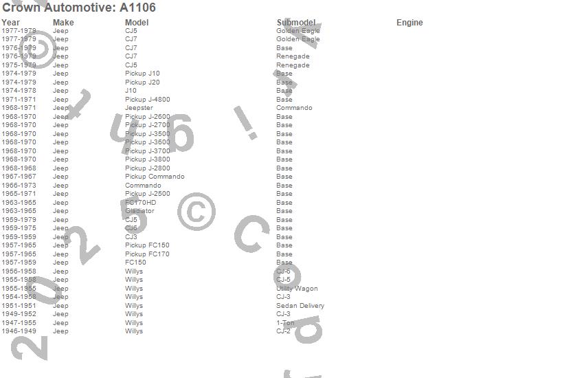 1-Ton Pickup, CJ-2A, CJ-3A, CJ-3B, CJ5, CJ6, CJ7, Commando, FC150, FC170, FC170HD, Gladiator, J-2500, J-2600, J-2700, J-2800, J-3500, J-3600, J-3700, J-3800 more…