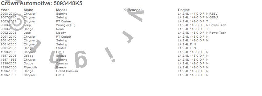 Breeze, Caravan, Cirrus, Grand Caravan, Liberty, Neon, PT Cruiser, Sebring, Stratus, Wrangler (TJ), Chrysler, Dodge, Jeep, Plymouth, 2010, 2009, 2008, 2007, 2006, 2005 more…