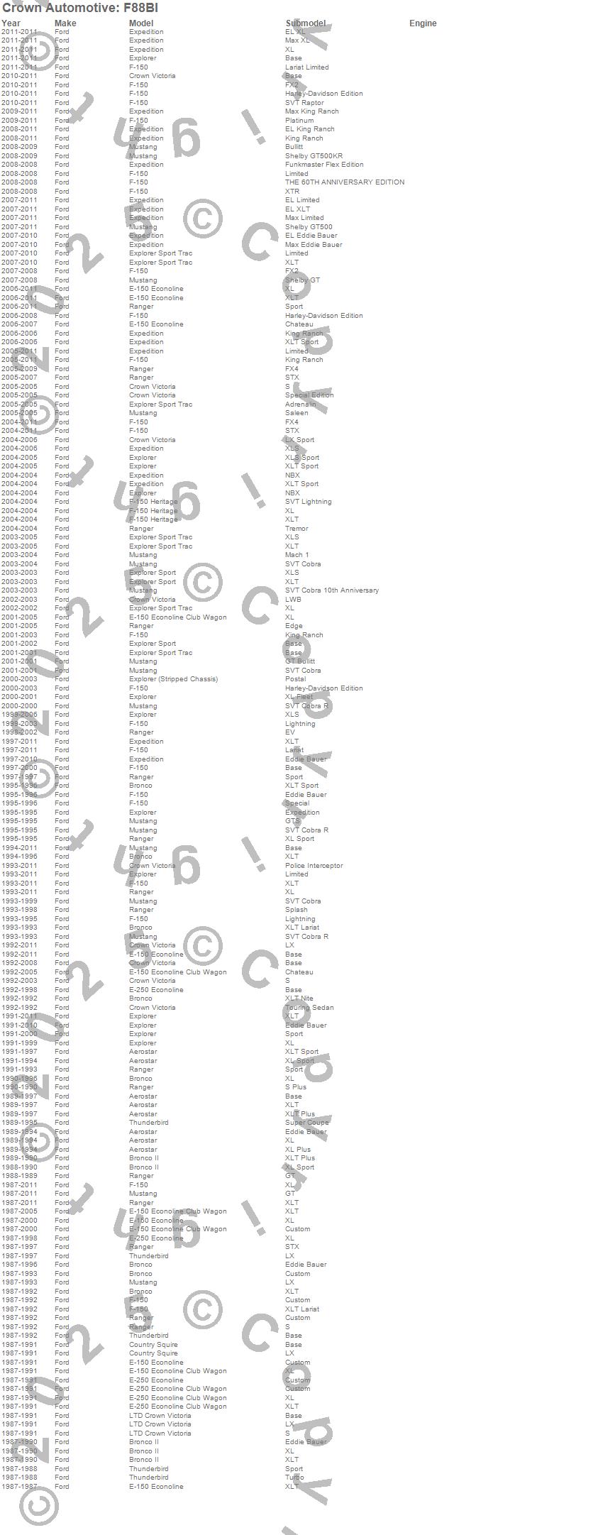 Aerostar, Bronco, Bronco II, Country Squire, Crown Victoria, E-150 Econoline, E-150 Econoline Club Wagon, E-250 Econoline, E-250 Econoline Club Wagon, Expedition, Explorer, Explorer Sport Trac, F-150, F-150 Heritage, LTD Crown Victoria, Mustang, Ranger, Thunderbird, Ford, 2011 more…
