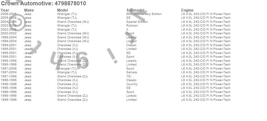 Crown Automotive is the premier manufacturer and distributor of quality replacement parts for Jeep® CJ™, Wrangler™, Cherokee™, Grand Cherokee™, Liberty™, and Commander™."From humble beginnings in 1963 in a small Boston storefront, Crown Automotive has consistently maintained its commitment to offering only quality parts and exceptional service. Today, with warehouses in Massachusetts, Georgia, Nevada, Spain, and the Czech Republic, totaling over 160,000 square feet, Crown Automotive continues to be the leader in quality replacement parts for Jeep® vehicles. With over 8,000 different parts in stock for Jeep® vehicles from 1942 on up, Crown has the largest stock of replacement parts for Jeep® vehicles, including factory-discontinued parts. In fact, many of the older Jeeps are still on (and off) the road thanks to Crown parts. The Crown line consists of axle, body, brake, clutch, cooling, driveline, electrical, engine, exhaust, fuel, steering, suspension, transmission and transfer case components. Crown Automotive also offers an exclusive line of component kits and accessory products. Because we know that Jeeps are driven harder than most other vehicles, we emphasize offering only quality parts. In fact, we test parts on Jeeps before distributing them to our dealers to insure that they meet our standards for quality. Crown also supports its entire line with a 12 month/12,000 mile warranty to insure our dealers and their customers of our commitment to offering quality parts. We know from experience that Jeep® owners would rather pay a little more for a good quality part that's backed by a strong guarantee. But we know that price is important as well. So, not only will you find Crown parts to be of exceptional quality, but you'll find them at a great price too.