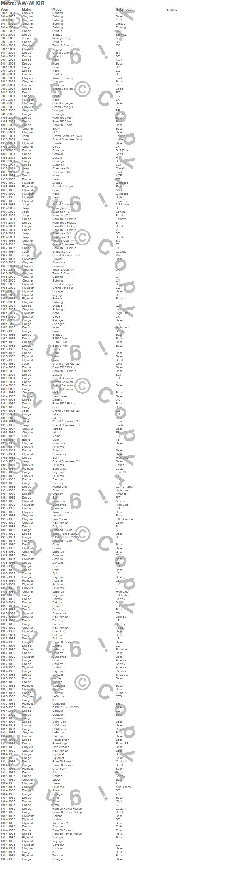 300M, Acclaim, Aries, Avenger, B150, B150 Van, B1500, B250, B250 Van, B2500, B350, B350 Van, B3500, Breeze, Caravan, Caravelle, Charger, Cherokee, Cherokee (XJ), Cirrus more…