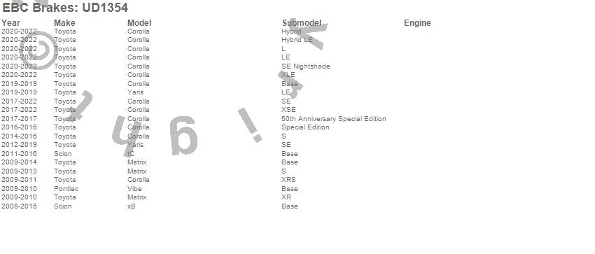 Below is an abreviated list of applications for the EBC Ultimax OEM Replacement Brake Pads. Corolla, Matrix, tC, Vibe, xB, Yaris, Pontiac, Scion, Toyota, 2016, 2015, 2014, 2013, 2012, 2011, 2010, 2009, 2008 more…