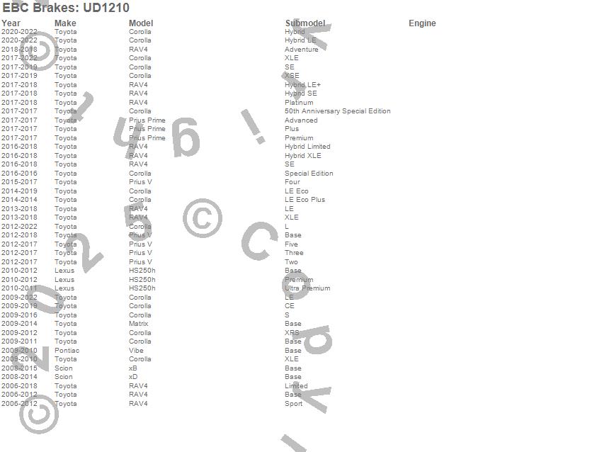 Below is an abreviated list of applications for the EBC Ultimax OEM Replacement Brake Pads. Corolla, HS250h, Matrix, Prius V, RAV4, Vibe, xB, xD, Lexus, Pontiac, Scion, Toyota, 2015, 2014, 2013, 2012, 2011, 2010, 2009, 2008 more…