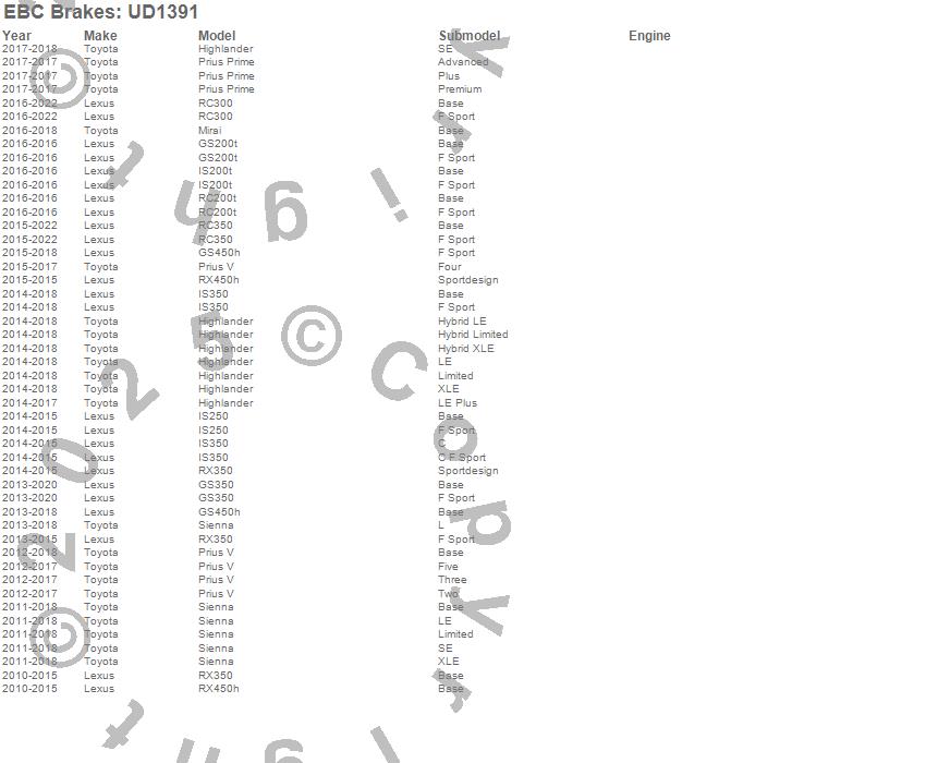 Below is an abreviated list of applications for the EBC Ultimax OEM Replacement Brake Pads. GS350, GS450h, Highlander, IS250, Prius V, RC350, RX350, RX450h, Sienna, Lexus, Toyota, 2016, 2015, 2014, 2013, 2012, 2011, 2010 more…