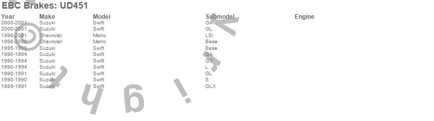 Below is an abreviated list of applications for the EBC Ultimax OEM Replacement Brake Pads. Metro, Swift, Chevrolet, Suzuki, 2001, 2000, 1999, 1998, 1997, 1996, 1995, 1994, 1993, 1992, 1991, 1990, 1989 more…