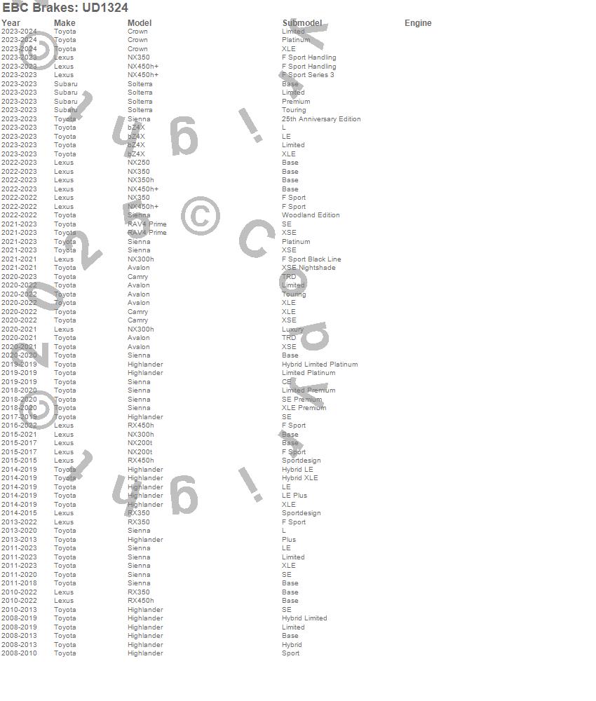 Below is an abreviated list of applications for the EBC Ultimax OEM Replacement Brake Pads. Highlander, NX200t, NX300h, RX350, RX450h, Sienna, Lexus, Toyota, 2016, 2015, 2014, 2013, 2012, 2011, 2010, 2009, 2008 more…