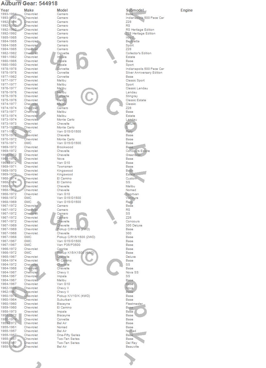 Bel Air, Biscayne, Brookwood, C10 Pickup, C15/C1500, Camaro, Caprice, Chevelle, Chevy II, Corvette, El Camino, G10 Van, G15/G1500 Van, Impala, K10 Pickup, K15/K1500, Kingswood, Malibu, Monte Carlo, Nomad more…