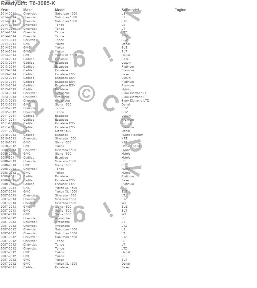 Below is an abreviated list of applications for the T6 Billet Front Leveling Kit.