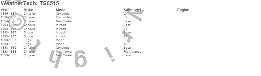 Below is an abreviated list of applications for the WeatherTech TechShade. Concorde, Intrepid, New Yorker, Vision, Chrysler, Dodge, Eagle, 1997, 1996, 1995, 1994, 1993 more…