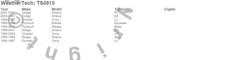 Below is an abreviated list of applications for the WeatherTech TechShade. Breeze, Cirrus, Stratus, Chrysler, Dodge, Plymouth, 2001, 2000, 1999, 1998, 1997, 1996, 1995 more…