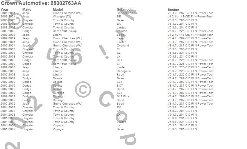 Dakota, Durango, Grand Cherokee (WJ), Liberty, Ram 1500, Town & Country, Voyager, Wrangler (TJ), Chrysler, Dodge, Jeep, 2004, 2003, 2002, 2001 more…