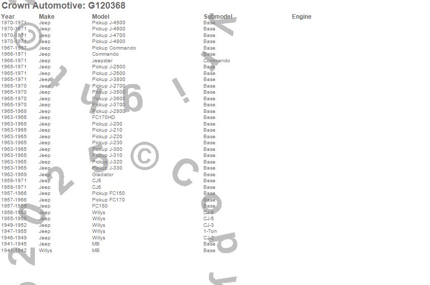 1-Ton Pickup, CJ-2A, CJ-3A, CJ5, CJ6, Commando, FC150, FC170, FC170HD, Gladiator, J-200, J-210, J-220, J-230, J-2500, J-2600, J-2700, J-2800, J-300, J-310 more…