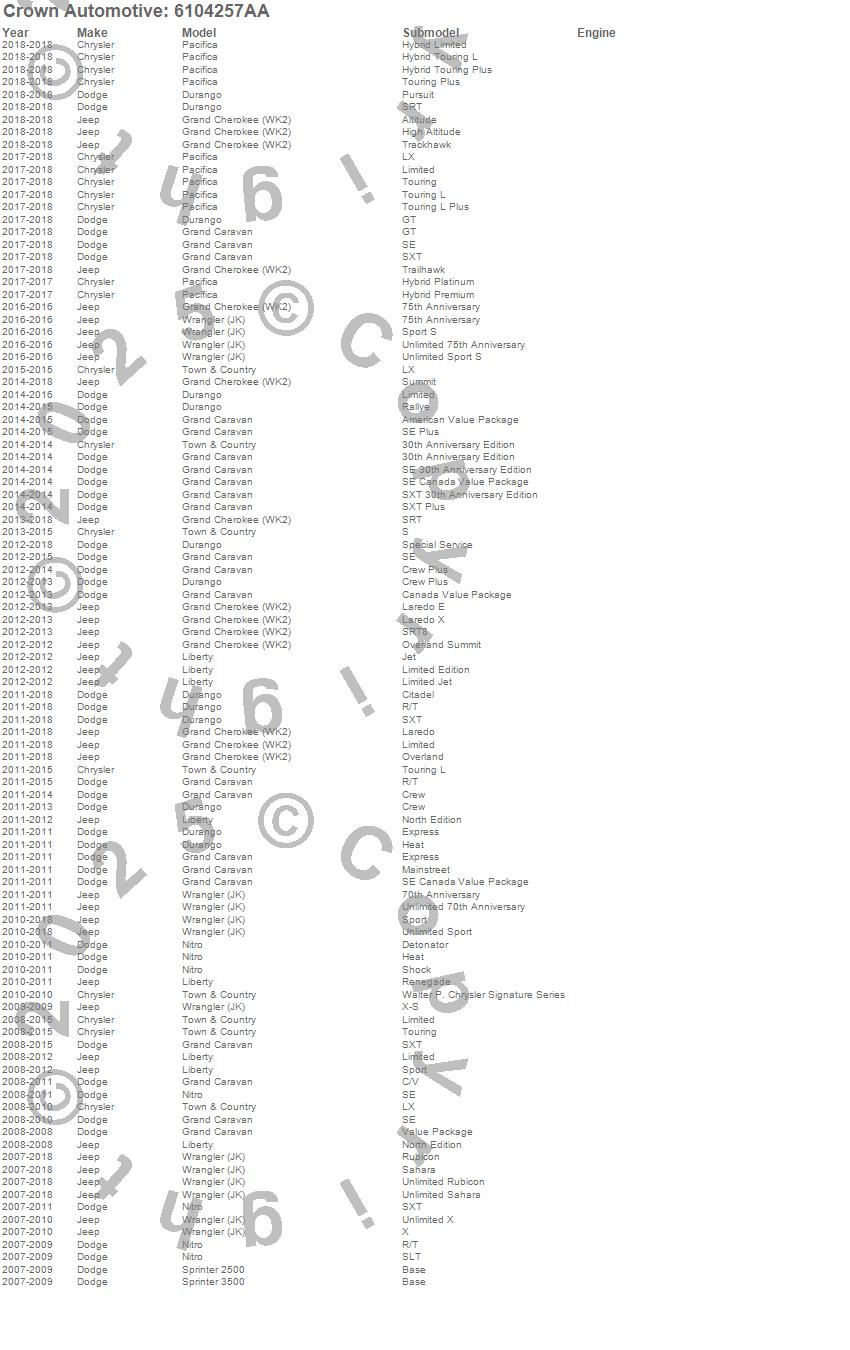 Caravan, Durango, Grand Caravan, Grand Cherokee (WK2), Liberty, Nitro, Sprinter 2500, Sprinter 3500, Town & Country, Wrangler (JK), Chrysler, Dodge, Jeep, 2015, 2014, 2013, 2012, 2011, 2010, 2009 more…