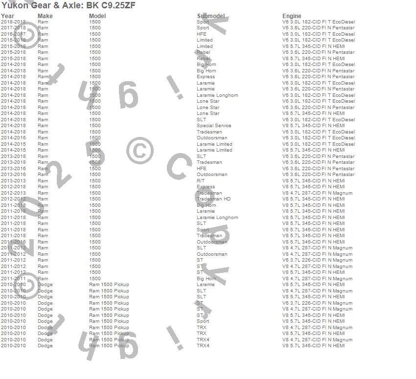 Below is an abreviated list of applications for the Differential Bearing Kit.
