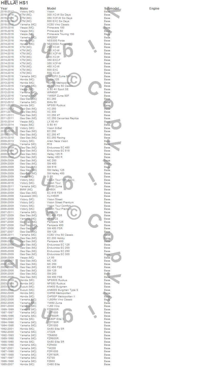 Below is an abreviated list of applications for the HS1 Halogen Bulb.