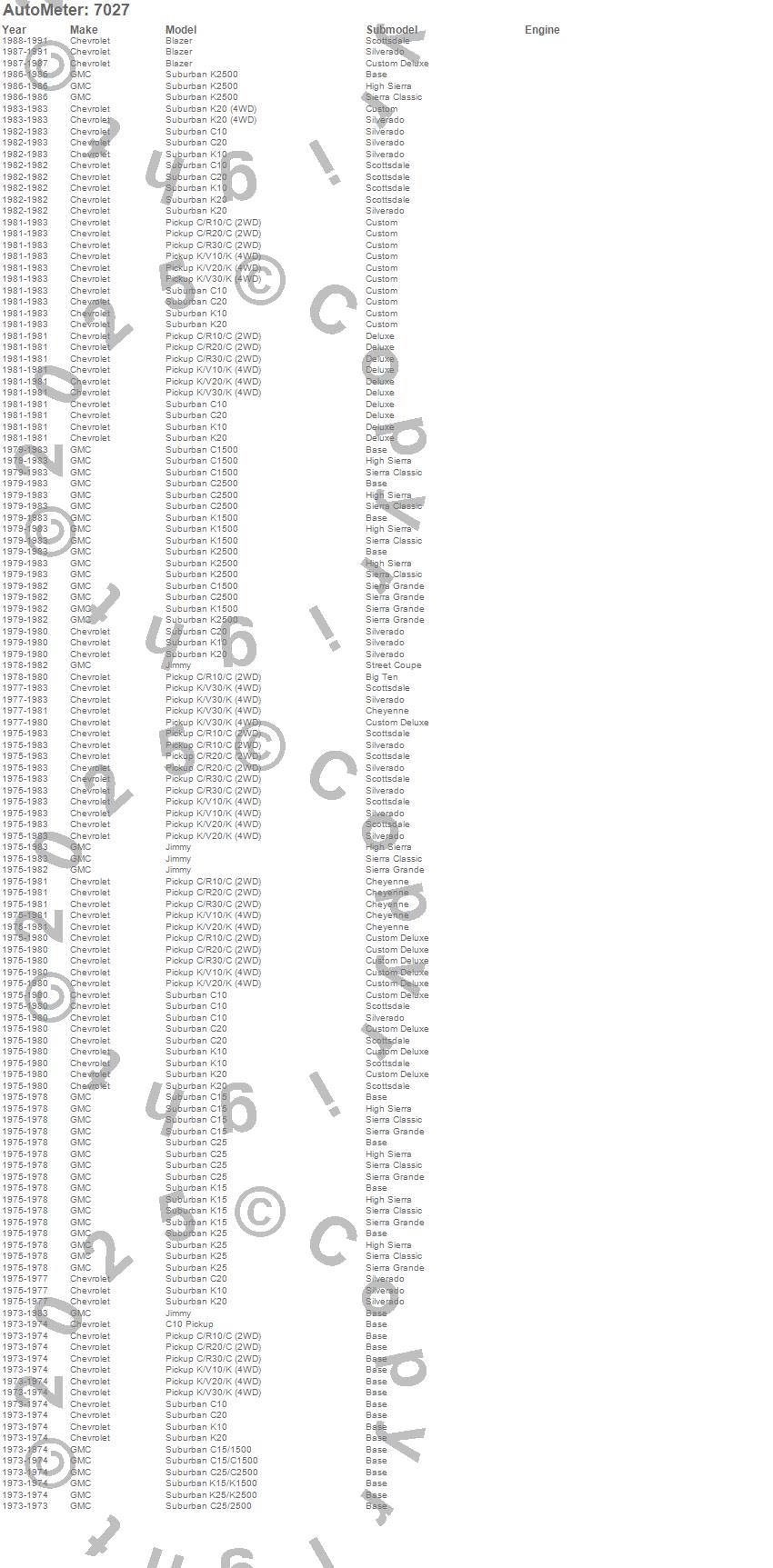 Blazer, C10 Pickup, C10 Suburban, C15 Suburban, C15/C1500 Suburban, C1500 Suburban, C20 Pickup, C20 Suburban, C25 Suburban, C25/C2500 Suburban, C2500 Suburban, C30 Pickup, Jimmy, K10 Pickup, K10 Suburban, K15 Suburban, K15/K1500 Suburban, K1500 Suburban, K20 Pickup, K20 Suburban more…