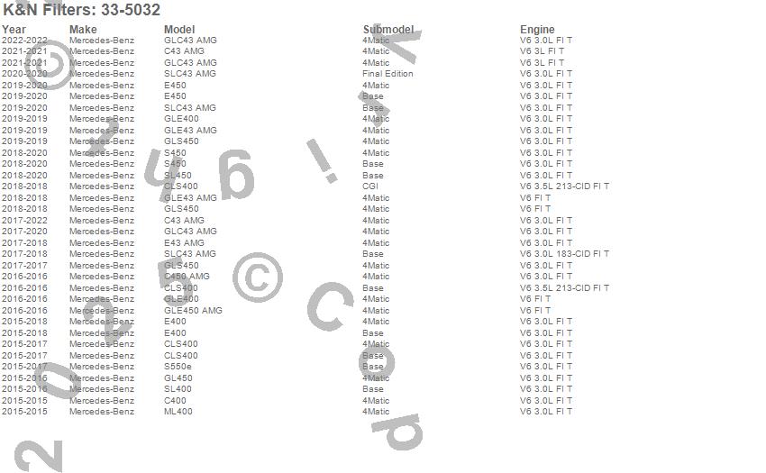 Below is an abreviated list of applications for the Air Filter.