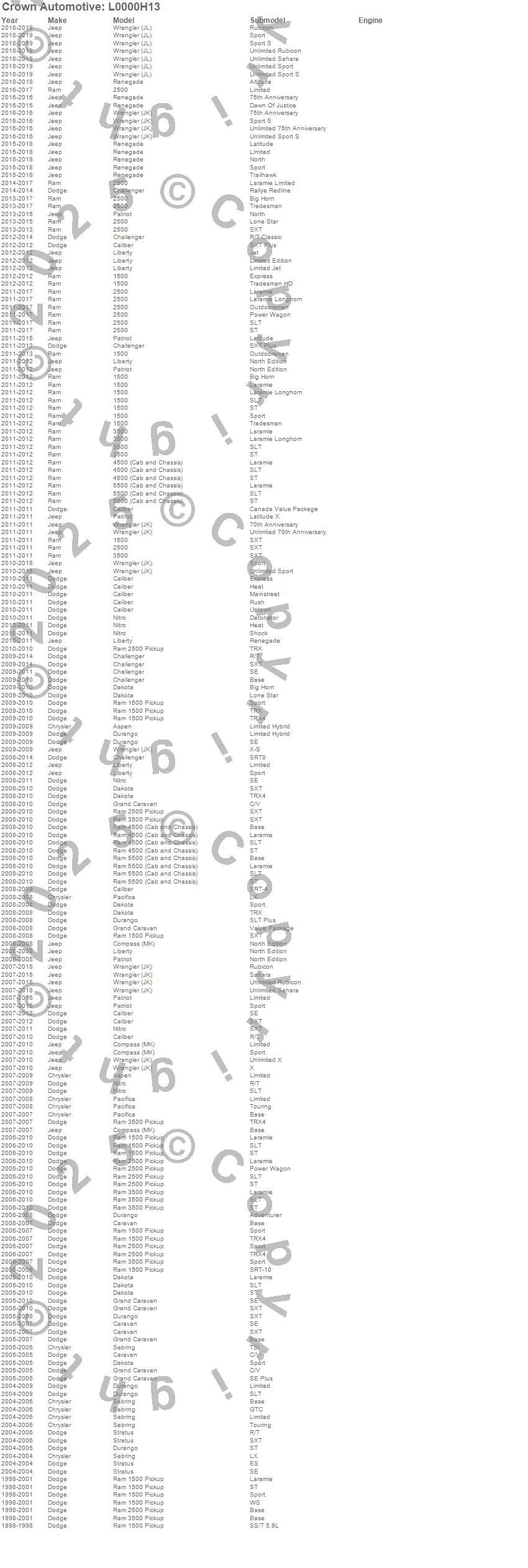 1500, 2500, 3500, 4500, 5500, Aspen, Caliber, Caravan, Challenger, Compass, Dakota, Durango, Grand Caravan, Liberty, Nitro, Pacifica, Patriot, Ram 1500, Ram 2500, Ram 3500 more…