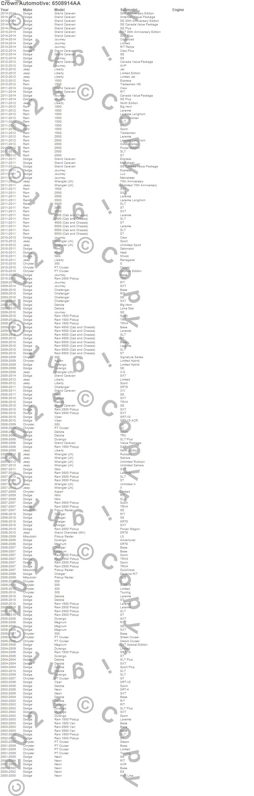1500, 2500, 300, 3500, 4500, 5500, Aspen, Challenger, Charger, Dakota, Durango, Grand Cherokee (WK), Journey, Liberty, Magnum, Neon, Nitro, PT Cruiser, Raider, Ram 1500 more…