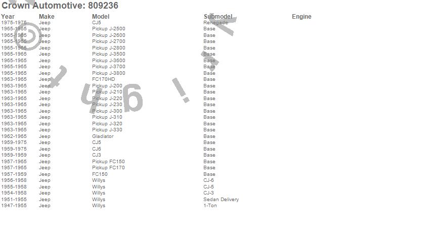 1-Ton Pickup, CJ-3B, CJ5, CJ6, FC150, FC170, FC170HD, Gladiator, J-200, J-210, J-220, J-230, J-2500, J-2600, J-2700, J-2800, J-300, J-310, J-320, J-330 more…