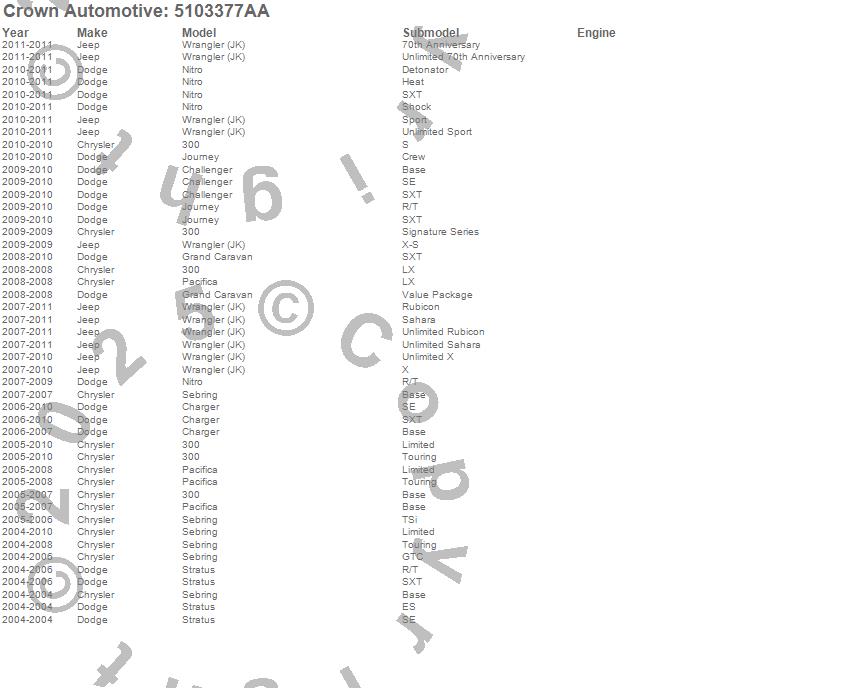 300, Challenger, Charger, Grand Caravan, Journey, Nitro, Pacifica, Sebring, Stratus, Wrangler (JK), Chrysler, Dodge, Jeep, 2011, 2010, 2009, 2008, 2007, 2006, 2005 more…