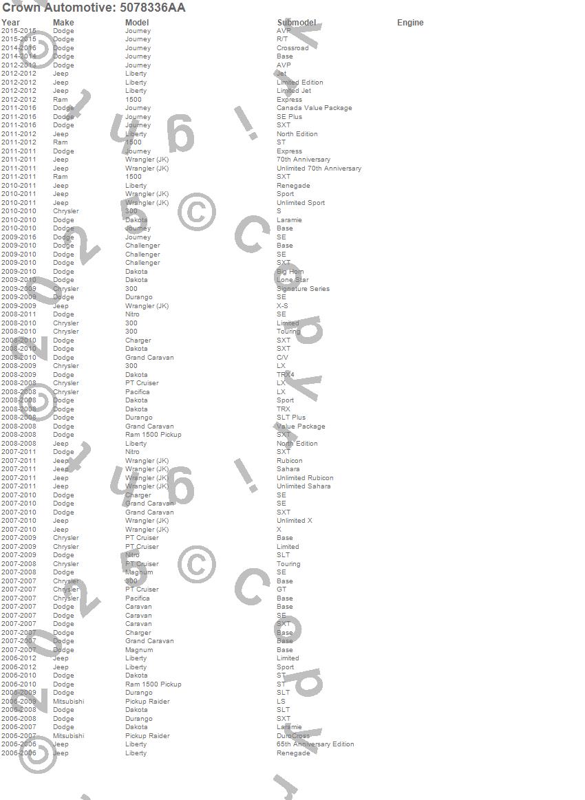 1500, 300, Caravan, Challenger, Charger, Dakota, Durango, Grand Caravan, Journey, Liberty, Magnum, Nitro, Pacifica, PT Cruiser, Raider, Ram 1500, Wrangler (JK), Chrysler, Dodge, Jeep more…
