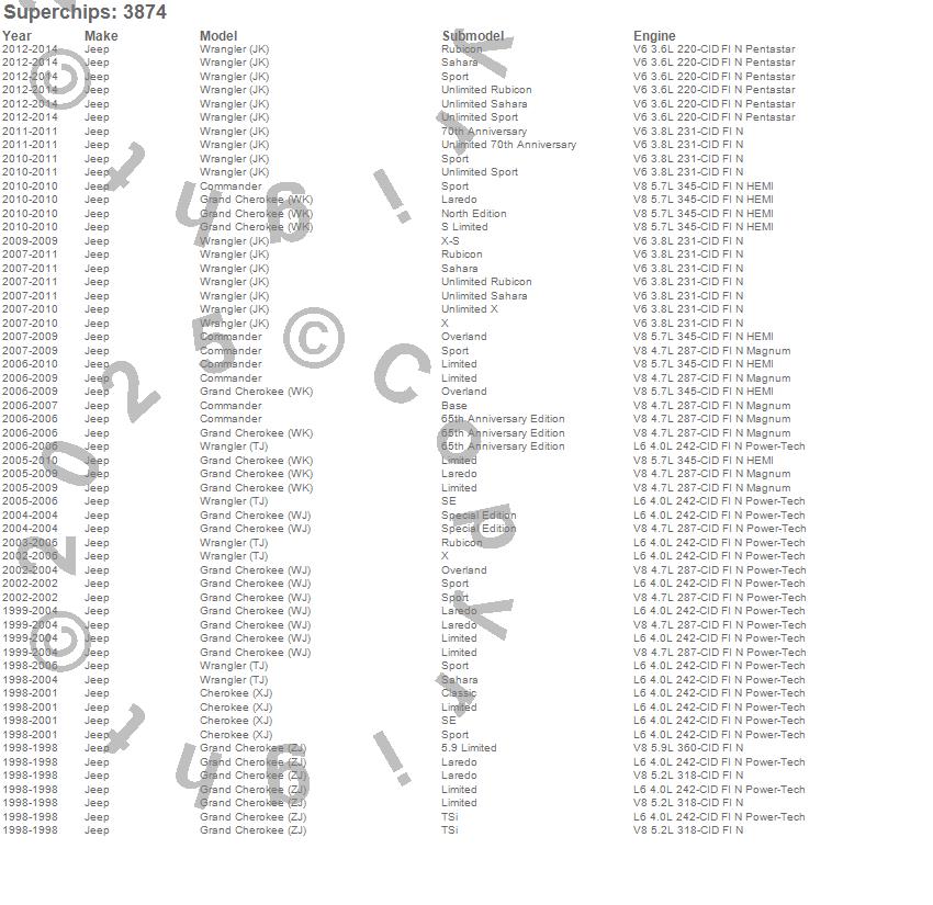 Cherokee (XJ), Commander, Grand Cherokee (WJ), Grand Cherokee (WK), Grand Cherokee (WK2), Grand Cherokee (ZJ), Wrangler (JK), Jeep, 2014, 2013, 2012, 2011, 2010, 2009, 2008, 2007, 2006, 2005, 2004, 2003 more…