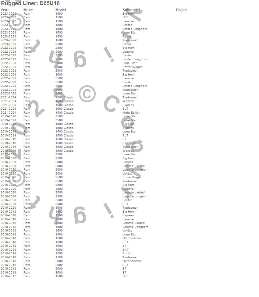 Rugged Liner Rugged Liner Under Rail Bed Liner D65U16 Features: