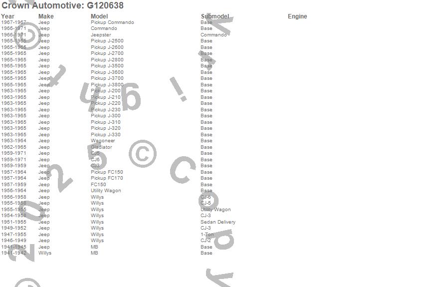 1-Ton Pickup, CJ-2A, CJ-3A, CJ-3B, CJ5, CJ6, Commando, FC150, FC170, Gladiator, J-200, J-210, J-220, J-230, J-2500, J-2600, J-2700, J-2800, J-300, J-310 more…