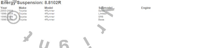 Below is an abreviated list of applications for the Shock Bushing Set. 4Runner, Toyota, 2009, 2008, 2007, 2006, 2005, 2004, 2003, 2002, 2001, 2000, 1999, 1998, 1997, 1996 more…