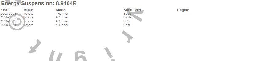 Below is an abreviated list of applications for the Bump Stop. 4Runner, Toyota, 2009, 2008, 2007, 2006, 2005, 2004, 2003, 2002, 2001, 2000, 1999, 1998, 1997, 1996 more…