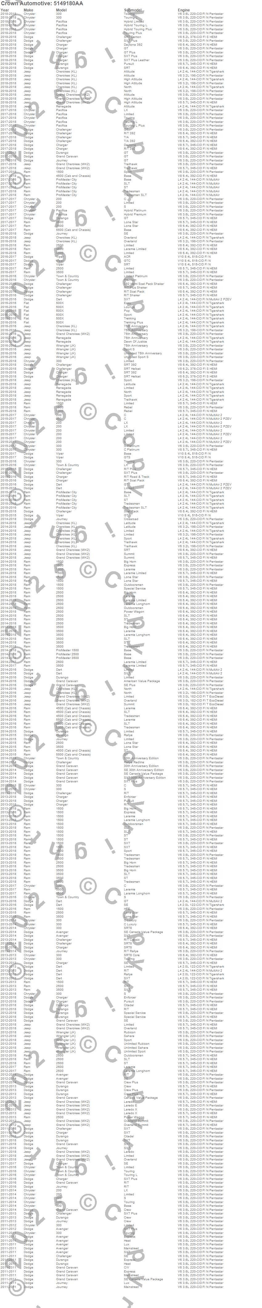 1500, 200, 2500, 300, 3500, 4500, 500X, 5500, Avenger, Challenger, Charger, Cherokee (KL), Dart, Durango, Grand Caravan, Grand Cherokee (WK2), Journey, ProMaster 1500, ProMaster 2500, ProMaster 3500 more…