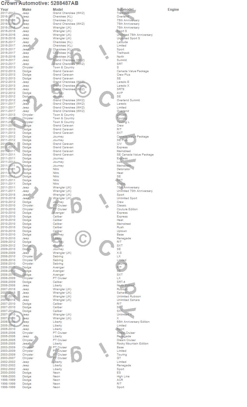 Avenger, Caliber, Cherokee (KL), Grand Caravan, Grand Cherokee (WK2), Journey, Liberty, Neon, Nitro, PT Cruiser, Sebring, Town & Country, Wrangler (JK), Chrysler, Dodge, Jeep, 2015, 2014, 2013, 2012 more…