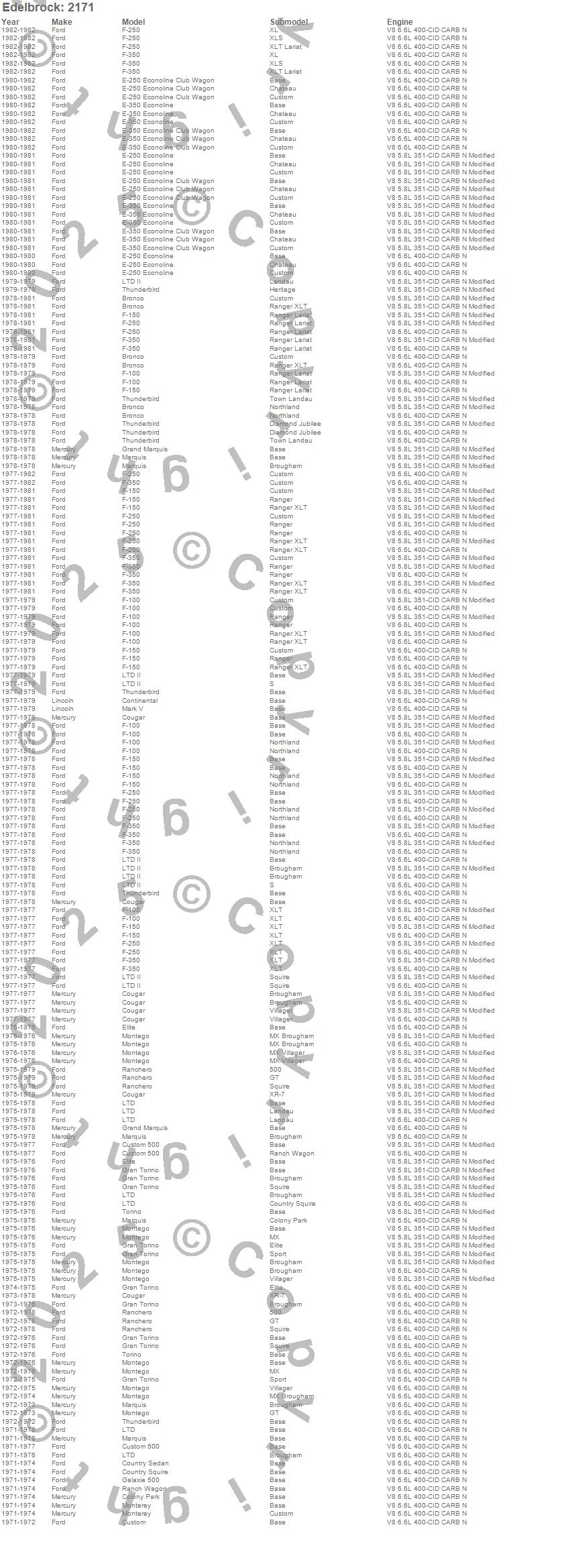 Bronco, Colony Park, Continental, Cougar, Country Sedan, Country Squire, Custom, Custom 500, E-250 Econoline, E-250 Econoline Club Wagon, E-350 Econoline, E-350 Econoline Club Wagon, Elite, F-100, F-150, F-250, F-350, Galaxie 500, Gran Torino, Grand Marquis more...