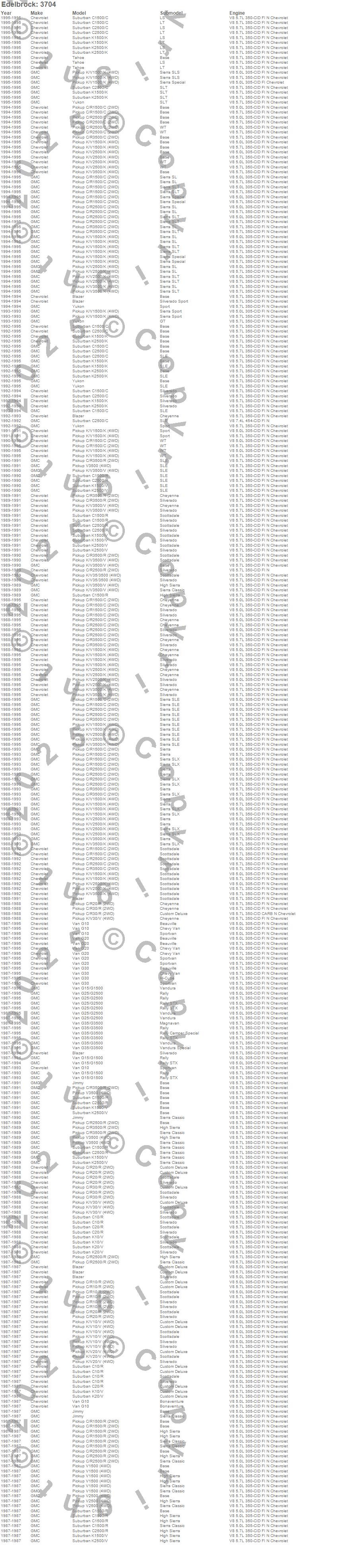 Blazer, C1500, C1500 Pickup, C1500 Suburban, C2500 Pickup, C2500 Suburban, C3500 Pickup, G10 Van, G15/G1500 Van, G20 Van, G25/G2500 Van, G30 Van, G35/G3500 Van, Jimmy, K1500, K1500 Pickup, K1500 Suburban, K2500 Pickup, K2500 Suburban, K3500 Pickup more…