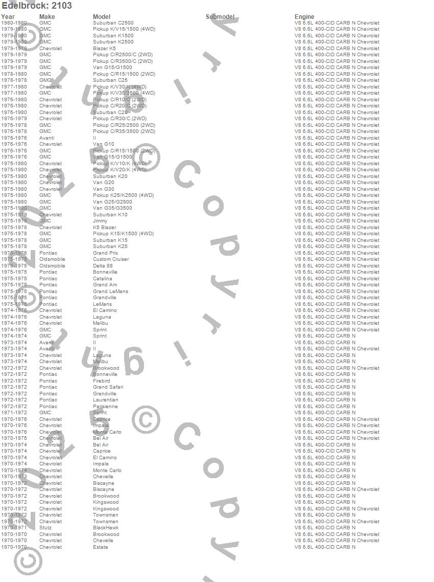 Bel Air, Biscayne, Blazer K5, Brookwood, C10 Pickup, C15/C1500, C1500, C20 Pickup, C20 Suburban, C25 Suburban, C25/C2500 Pickup, C2500 Pickup, C2500 Suburban, C30 Pickup, C3500 Pickup, Caprice, Chevelle, El Camino, G15/G1500 Van, G20 Van more…