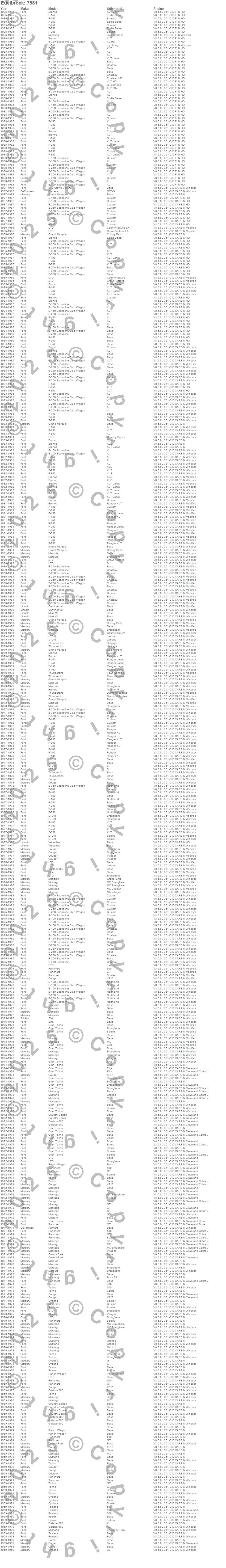 Bronco, Continental, Cougar, Country Sedan, Country Squire, Custom, Custom 500, E-100 Econoline, E-100 Econoline Club Wagon, E-150 Econoline, E-150 Econoline Club Wagon, E-250 Econoline, E-250 Econoline Club Wagon, E-350 Econoline, E-350 Econoline Club Wagon, Elite, F-100, F-150, F-250, F-350 more…