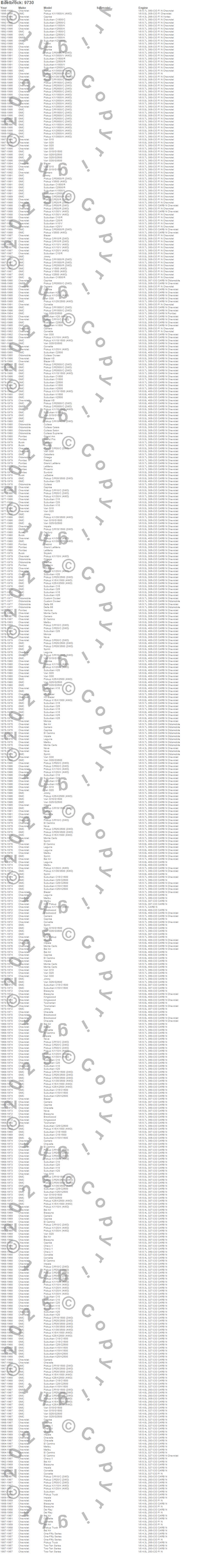 Bel Air, Biscayne, Blazer, Blazer K5, Brookwood, C10 Pickup, C10 Suburban, C15 Suburban, C15/C1500, C15/C1500 Suburban, C1500, C1500 Pickup, C1500 Suburban, C20 Pickup, C20 Suburban, C25 Suburban, C25/C2500 Pickup, C25/C2500 Suburban, C2500 Pickup, C2500 Suburban more...