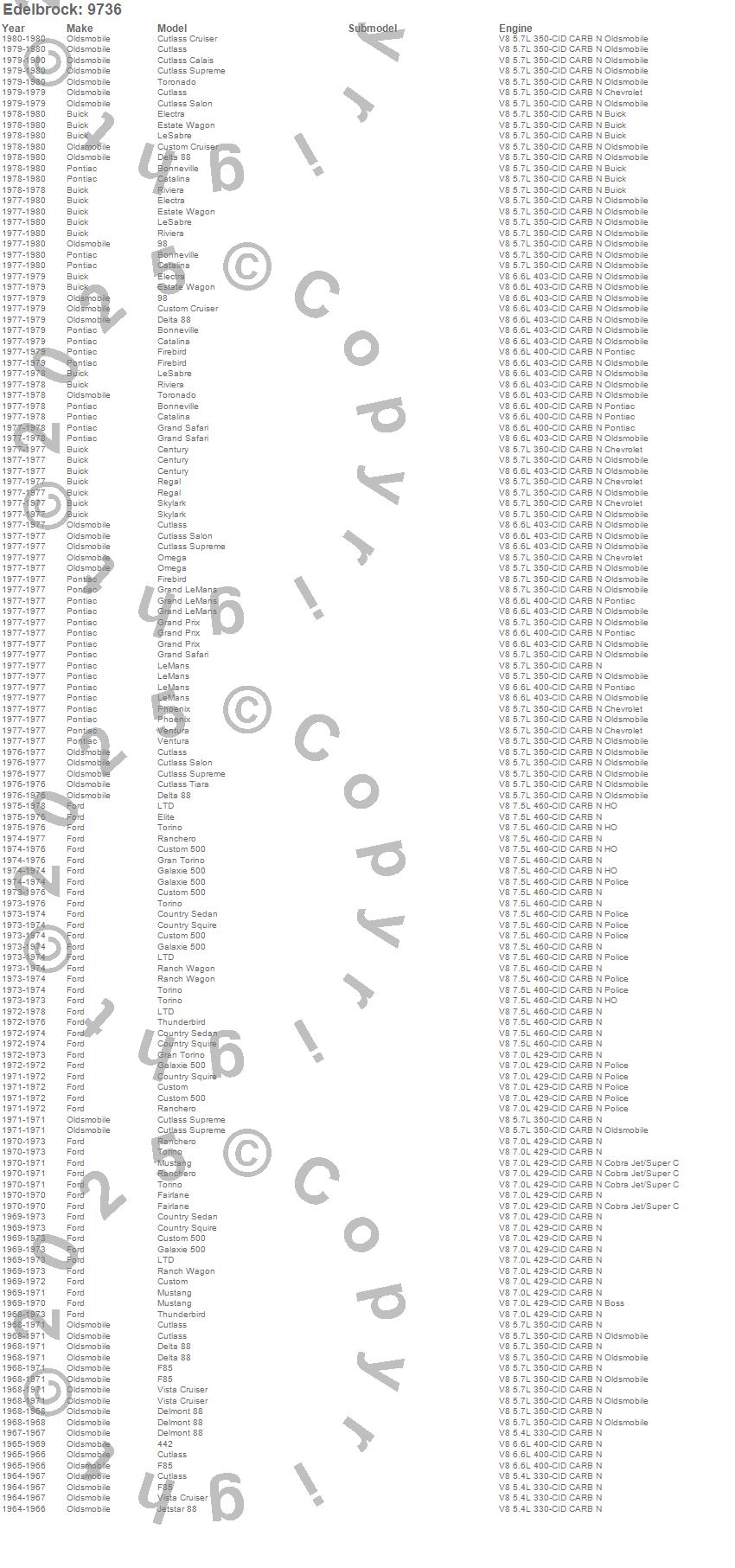 442, 98, Bonneville, Catalina, Century, Country Sedan, Country Squire, Custom, Custom 500, Custom Cruiser, Cutlass, Cutlass Calais, Cutlass Cruiser, Cutlass Salon, Cutlass Supreme, Cutlass Tiara, Delmont 88, Delta 88, Electra, Elite more...