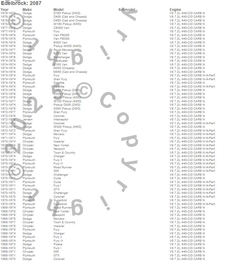 300, B100 Van, B200 Van, B300 Van, CB300 Van, Challenger, Charger, Coronet, Cuda, D100 Pickup, D150 Pickup, D200 Pickup, D300 Pickup, D450 Pickup, Fury, Fury I, Fury II, Fury III, Gran Fury, GTX more...