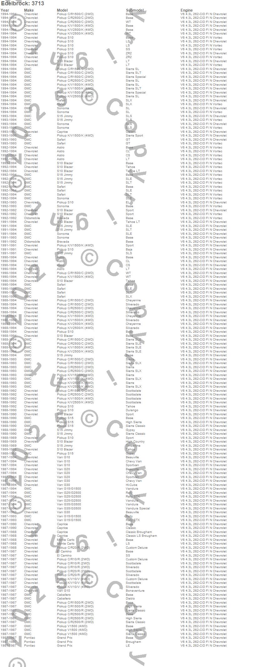 Below is an abreviated list of applications for the Performer 4.3L T.B.I. V6 Intake Manifold.