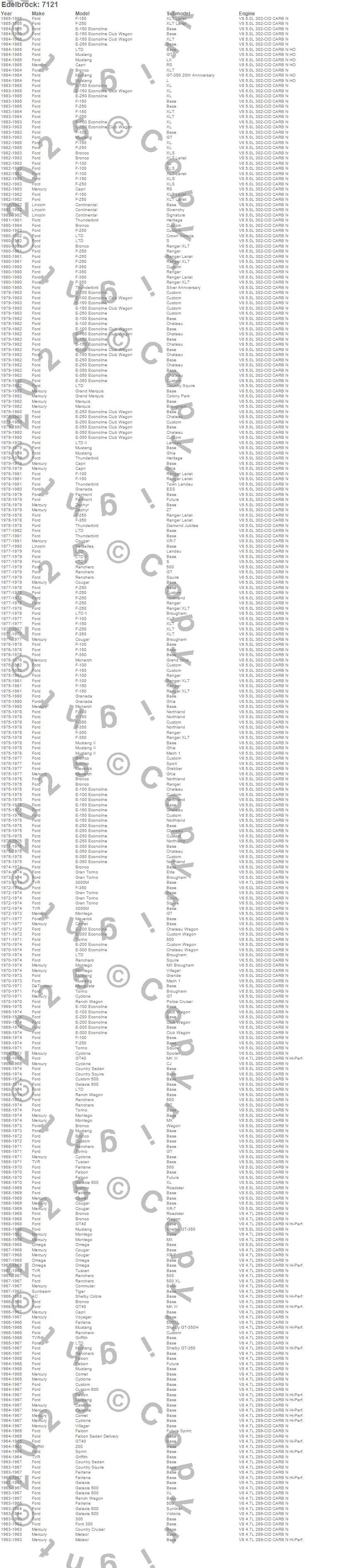 Bronco, Capri, Club Cargo, Comet, Commuter, Continental, Cougar, Country Sedan, Country Squire, Custom, Custom 500, E-100 Econoline, E-150 Econoline, E-200 Econoline, E-250 Econoline, E-300 Econoline, E-350 Econoline, F-100, F-150, F-250 more…
