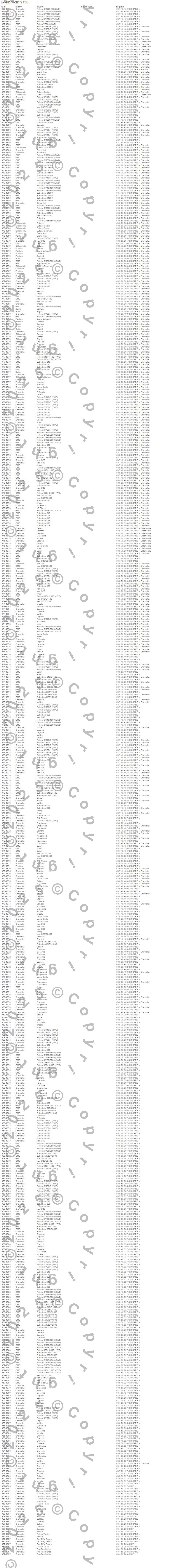 Bel Air, Biscayne, Blazer, Blazer K5, Bonneville, Brookwood, C10 Pickup, C10 Suburban, C15 Suburban, C15/C1500, C15/C1500 Suburban, C1500, C1500 Suburban, C20 Pickup, C20 Suburban, C25 Suburban, C25/C2500 Pickup, C25/C2500 Suburban, C2500 Pickup, C2500 Suburban more...