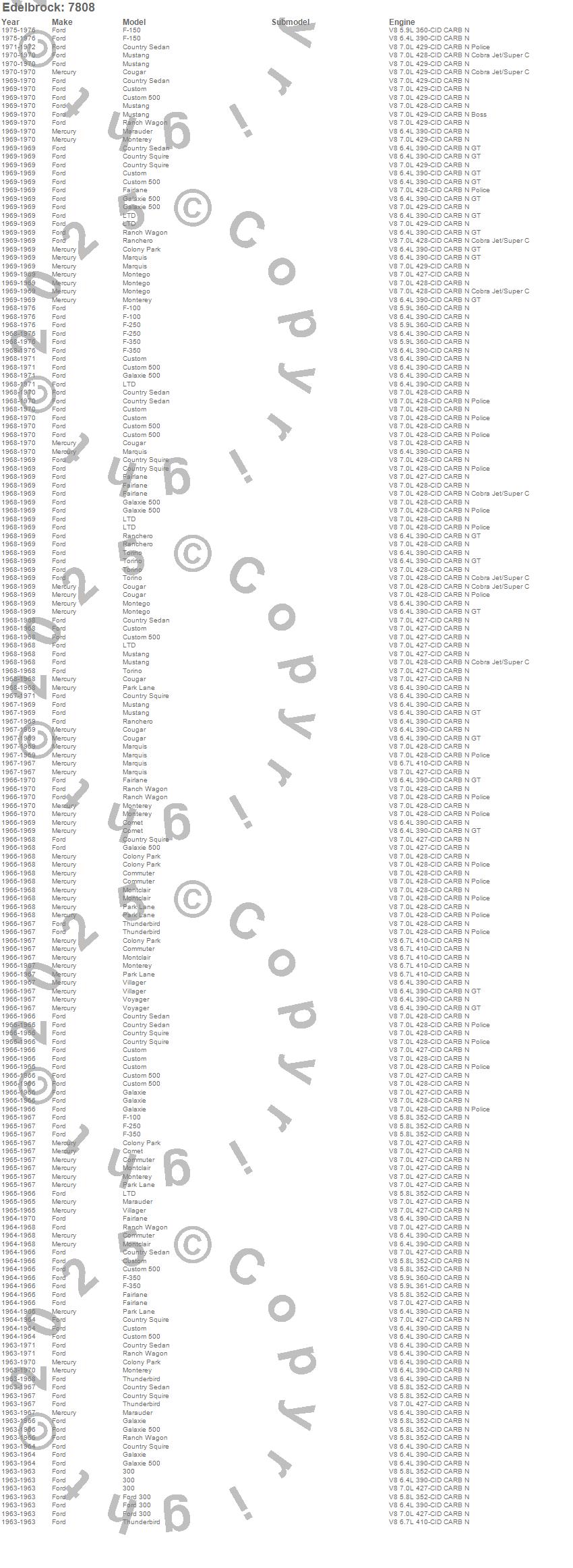 Club Cargo, Colony Park, Comet, Commuter, Cougar, Country Sedan, Country Squire, Custom, Custom 500, F-100, F-150, F-250, F-350, Fairlane, Ford 300, Galaxie, Galaxie 500, LTD, Marauder, Marquis more…